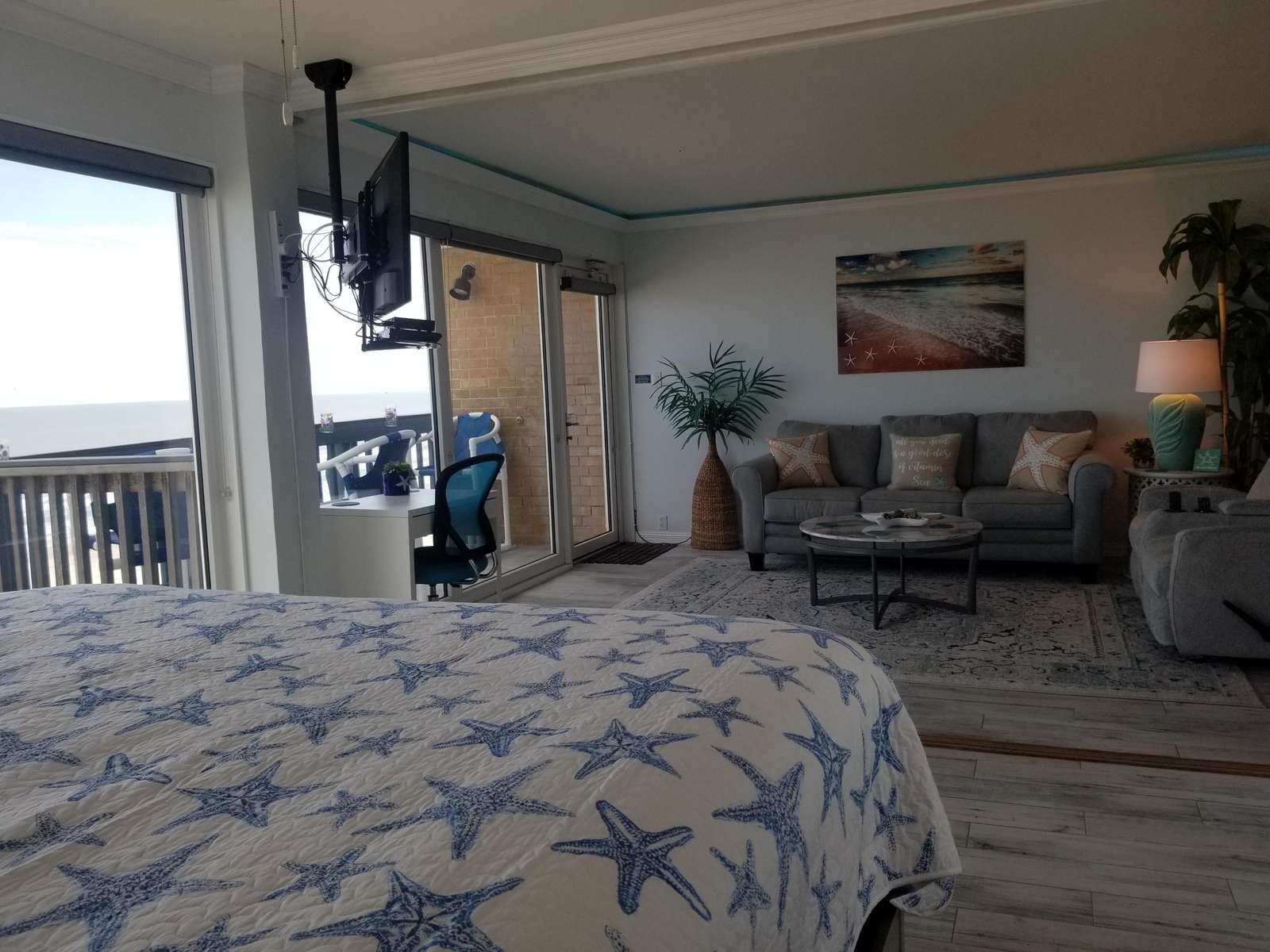 But the excitement doesn't stop there. You'll stay in a beautifully remodeled Penthouse with panoramic views of the stunning Texas Gulf. No sand dunes will block your breathtaking views of the mile long seawall and boardwalk. The floor to ceiling windows in the living area and master bedroom will leave you in awe from sunrise to sunset, and the balcony offers a perfect spot to enjoy the sea breeze.